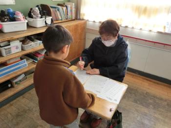 丸付け先生ありがとう 毎週水曜日の朝の時間はチャレンジタイムです。1年生と2年生の教室には、丸付けボランティアの2人の先生が来てくださいます。今日は今年度最後の丸…