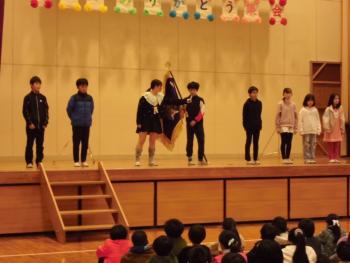 校旗伝承式 今までありがとう集会 今日は、朝から「校旗伝承式」と「今までありがとう集会」を行いました。「校旗伝承式」では、6年生から5年生へ校旗か引き継がれました。6年生は…