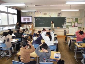 外国語活動 4年生 4年生の教室に行ってみると、外国語活動の授業の中でアルファベットカードの取り合いをするゲームを行っていました。頭の上に手を置いてお手つきし…