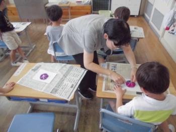 朝顔の花を使って 1年生が生活科の学習で育てている朝顔は、毎日次々と花を咲かせています。紫や青の花がまた一つと開くのを、子どもたちはとても楽しみにしています…