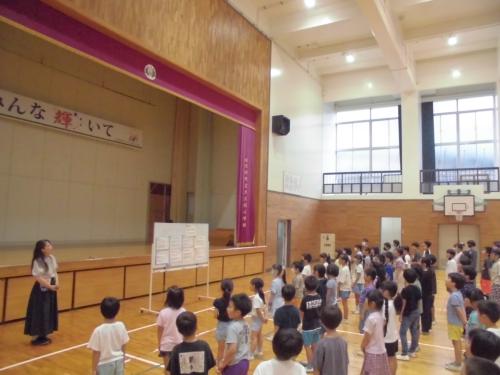 さわやかタイム 今日の朝の時間は、さわやかタイムでした。今回は、8月9日の平和集会で歌う「心から心へ」の練習をしました。