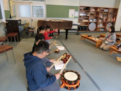 たいこにちょうせん 3年生は音楽の時間に太鼓に挑戦しました。「テン、テ、テ、ツクツク、テン、ス、ケ、テン、ヤ」のリズムに合わせて、太鼓を打つまねをしたり、手で机…