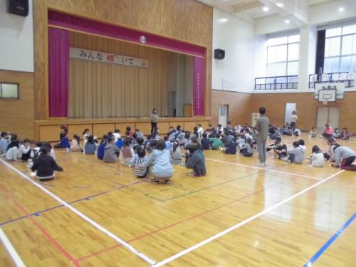 町別児童会・縦割り活動 4月11日(木)、今日は朝から体育館に全児童が集まり、町別児童会と縦割り活動班の顔合わせを行いました。