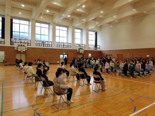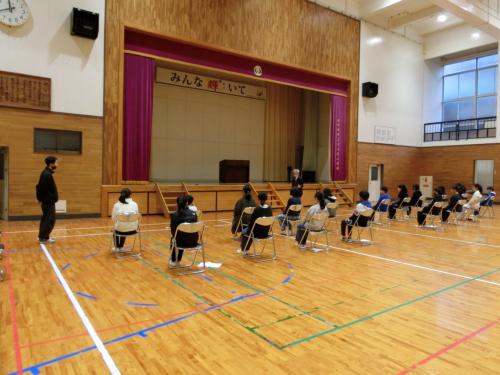 卒業式の練習 3月18日の卒業式に向け、初めて全校揃って練習をしました。呼びかけの言葉をゆっくりとていねいに言うこと、前の人のことばの後に間をおくことなど…