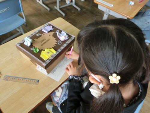 かざってなにいれよう 1年生の図工の学習は「かざってなにいれよう」です。自分で準備したいろいろな形の箱に、折り紙やボタン、ビーズやストローなど、いろいろな飾りをつ…