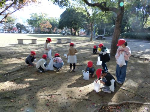 秋探し 1年生は佐世保公園に「秋探し」に出かけました。公園に着くと、いよいよ秋探しの始まりです。小春日和の中、子どもたちは、どんぐりやまつぼっくり、…
