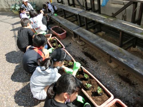 花の苗植え 今日5年生は、正面玄関前のプランターに花の苗を植えました。まずは土を柔らかくほぐして石灰を混ぜます。その土に、友達と協力しながらビオラとよく…