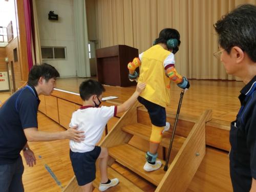高齢者・障がい者疑似体験教室 3年生の総合的な学習の時間は、福祉の学習をしています。今日は「高齢者・障がい者疑似体験教室」を行いました。講師は佐世保市福祉活動プラザの先生…