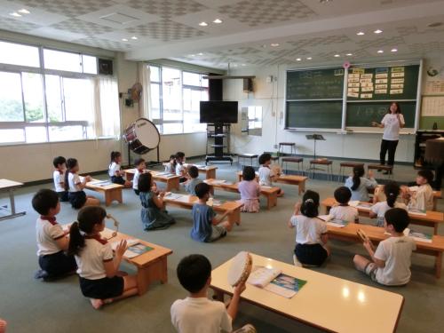 3拍子のリズム 2年生は音楽で、3拍子を感じながらリズムを打つ学習をしました。「いるかはざんぶらこ」という曲に合わせて、「ウン(休み)・タン・タン」や「タン…
