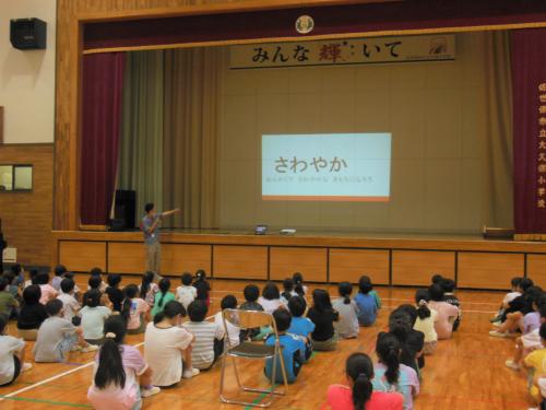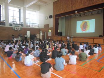 平和集会(佐世保空襲の日) 今日6月29日は「佐世保空襲の日」です。大久保小学校でも1時間目に平和集会を行いました。佐世保空襲についての話や、「赤いくつ」という本の職員…