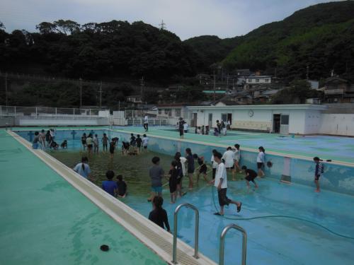 プール開き 今日はプール開きです。3〜6年生できれいに掃除をしたプールで、いよいよ水泳の学習が始まりました。はじめにプールに入ったのは6年生。泳いだり、…
