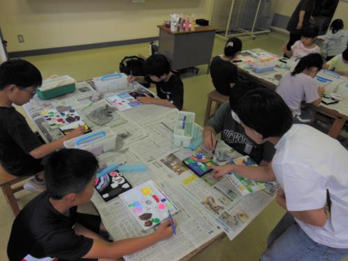 100周年アート 今日は佐世保市出身のアーティストKEIKO先生を講師にお招きして、創立100周年を記念したアート作品の制作に取り組みました。子どもたちは1枚…