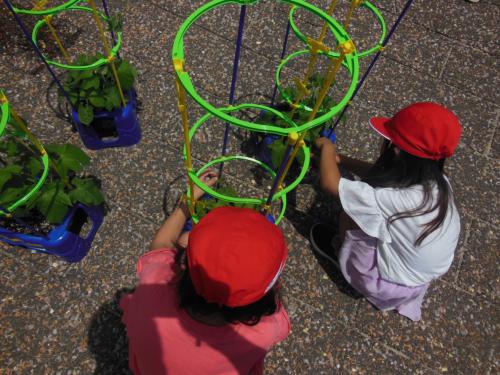 アサガオが大きくなったよ 1年生が大切に育てているアサガオがぐんぐん大きく育っています。今日もみんなで観察しました。「昨日よりも高くなったよ。」「葉っぱも大きくなって…
