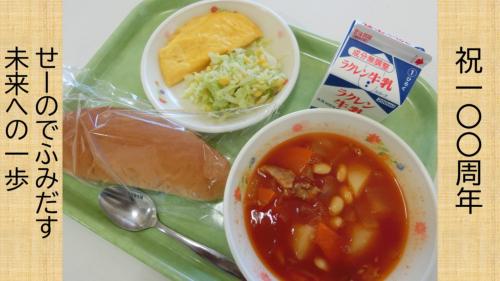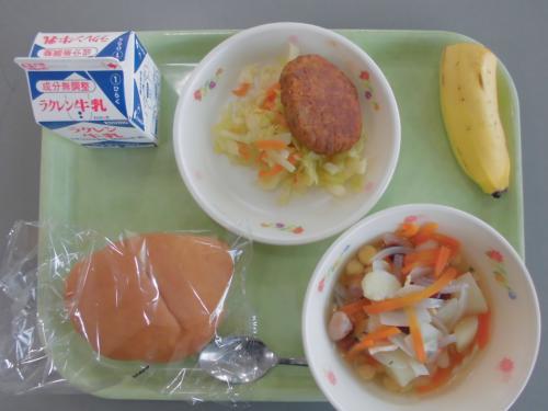 4月10(水)今日の給食 牛乳 パーカーハウスパン ビーンズスープ 煮込みハンバーグ キャベツのソテー バナナ