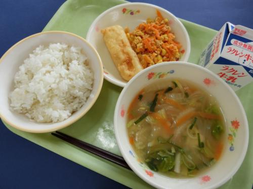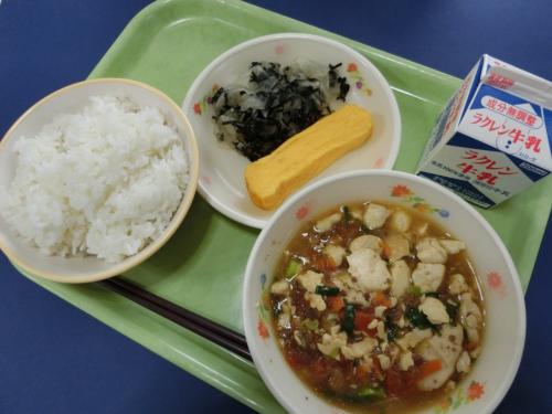 1/18(木)今日の給食 ぎゅうにゅう ごはん いりどうふ あつやきたまご いそかあえ