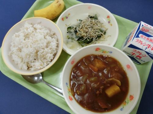 2/15(木)今日の給食 ぎゅうにゅう ポークカレー(むぎごはん) じゃこサラダ(しらすぼし) バナナ