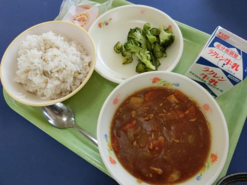 3/8(金)今日の給食 ぎゅうにゅう チキンカレー(むぎごはん) ブロッコリーサラダ やきプリンタルト