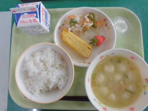 4月11日(木)今日の給食 牛乳 ごはん つみれ汁 厚焼き卵 切り干し大根の酢の物 いちご