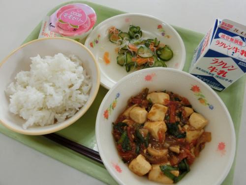 4月9日(火)今日の給食 牛乳 ごはん マーボー豆腐 バンサンスー 桃ゼリー
