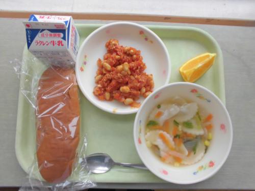 4月15日(月)今日の給食 牛乳 コッペパン ラビオリスープ チリコンカーン オレンジ