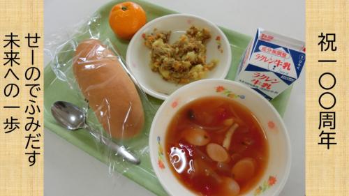 11/13(月)今日の給食 ぎゅうにゅう コッペパン こめこととうにゅうのポタージュ ツナサラダ