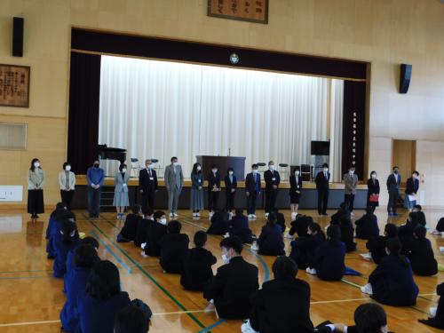 着任式、前期始業式がありました 本日(4/6)に令和3年度の着任式、前期始業式を行いました。着任式では、新たに5名の先生方が着任し、2、3年生へ紹介しました。続いて始業式で…