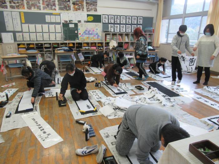 書初めにチャレンジ 3連休を挟んで、学校もいよいよ本格的に始まりました。