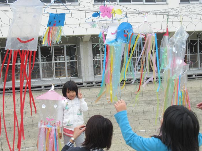 ひらひらゆれて【1年生】 1年生の子どもたちが、図工「ひらひらゆれて」の学習を運動場で行っていました。それぞれ針金ハンガーをベースにいろいろな形を作ってひらひらをくっ…