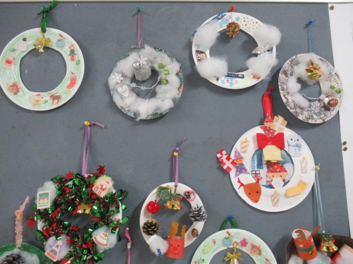 クリスマスリース作製! クラブ活動で、手作り・イラストクラブがクリスマスリースを作製しました。身近な材料で、とってもかわいく作れましたよ。