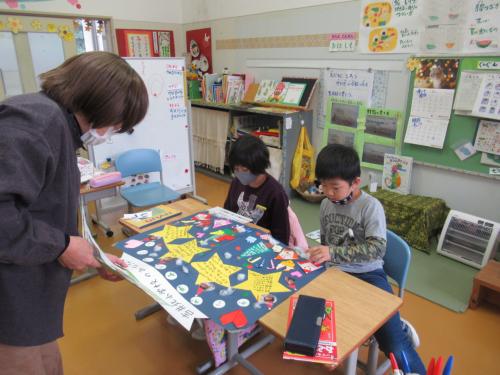 プレゼントが届いたよ もみじ学級の子どもたちに、世知原小学校のお友達からプレゼントが届きました。