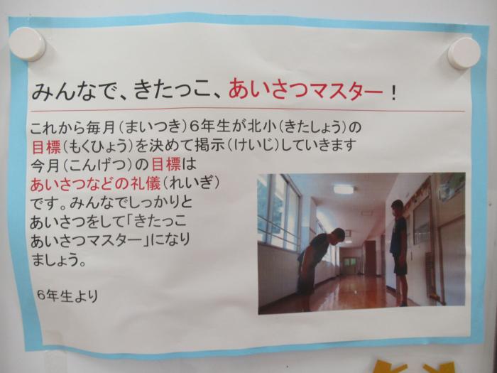 行動する子供たち 6年生の教室に何やらタスキがかけてあります。児童玄関には6年が作成したポスターが貼ってありました。6年生が展開している「あいさつマスター」の…