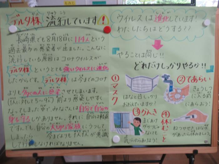 玄関には、養護教諭が作ったコロナ対策の注意…