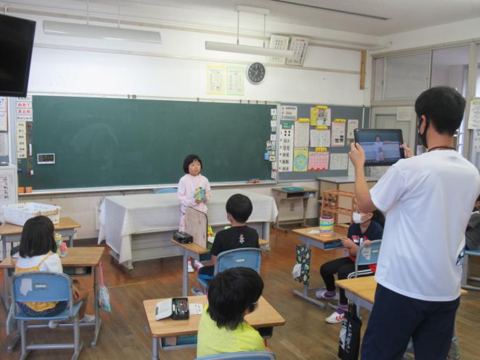夏休みの作品作り、がんばったよ!【3年生】 3年生の教室を通りかかると、ちょうど夏休みの作品についてそれぞれ発表し、動画を撮っていました。