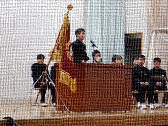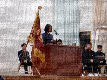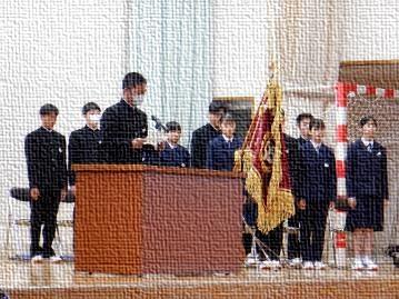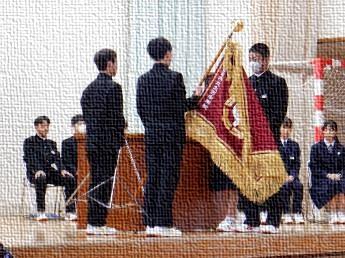 新生徒会長 こんにちは。Mです。私が生徒会長になった理由の一つは、生徒会長への憧れでした。その憧れのM会長から校旗を受け取り、私は今やる気に満ち溢れて…