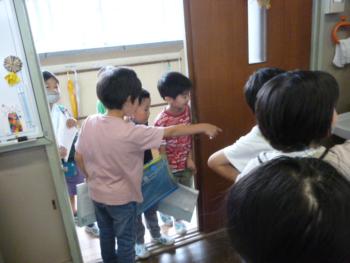 学校探検(1・2年生活科) 2年生が1年生を連れて、校内を案内してまわります。いろいろな教室がなんのためにあるのか、どんなものがあるのかを楽しく仲良く見ています。