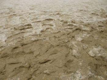 運動場を大切にしよう 雨上がりの運動場です。登下校時には運動場を横切らないとの約束があるのに守れていません。みんなが使う運動場。足跡が残ったまま固まるとどうなる…