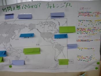 何問できるかな(5年社会) 世界地図とクイズが掲示されています。答えられたらシールを貼るようになっています。