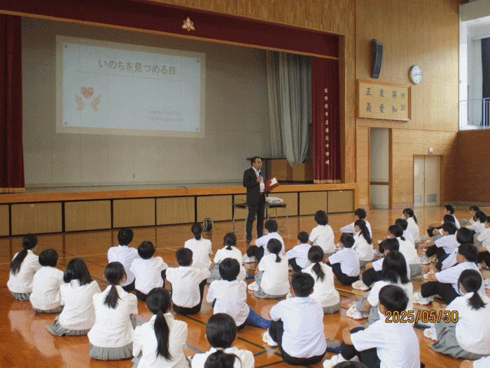 いのちかがやく強調月間〜いのちの講話〜 佐世保市では、6月を「いのちかがやく強調月間」としています。そこで、5月30日金曜日に全校集会を開き、校長講話の中で大阪関西万博に関連して…
