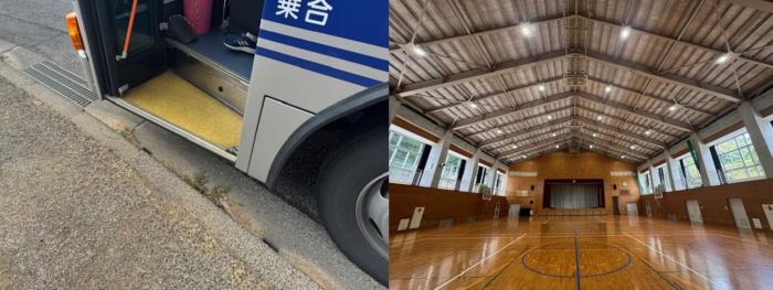 プロの技に学ぶ 上の写真を御覧ください。左側は朝、子供たちの乗って登校しているバスが、学校前の停留所に止めた時の出口の写真です。右側は、体育館の照明がLED…