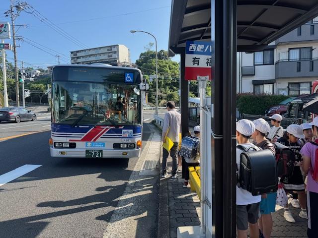 車に気を付けて! 毎朝、江上小学校までくる1便と2便のバス、江上小入口バス停合わせて、約80人ほどが登校しています。その子供たちが乗るバス停すべてに保護者や地…