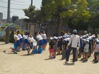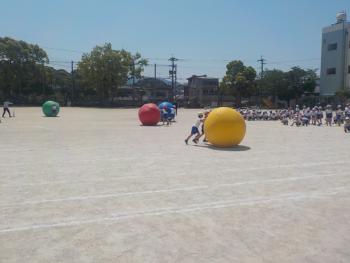 大玉ころがし 2年生が、大玉転がしの練習をしていました。2年生は4クラスあるので、4色に分かれて競技を行います。今日の練習も4色が競い合って取り組んでいま…