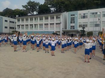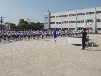 全体練習 開会式を中心に 1校時に全体練習を行いました。今回は、主に開会式を中心に行いました。礼法や歌、ラジオ体操などの練習を行いました。どの学年も真剣に行いました。