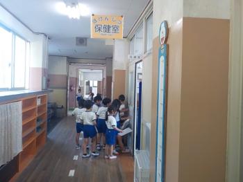 学校探検 低学年が学校探検をしました。2年生が1年生を案内して、学校にどのような教室があるのか確かめ合っていました。2年生に手を引っ張られている1年生…
