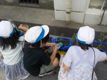トマトを育てます 2年生がトマトのお世話をしていました。ペットボトルに水を入れ、自分がお世話するトマトに水をやっていました。中には、じょうろを使って水をやる子…