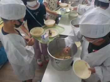 給食おいしいよ 季節の物を給食で食べようということで、今日はインゲン豆の炒め物を食べました。手際よく配膳を行って、その後おいしそうに食べていました。