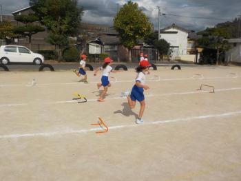 障害走 ハードル間が違う3つのレーンで、3年生が障害走に取り組んでいました。自分に合ったレーンを使って、友達と競争していました。
