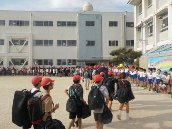 修学旅行1日目 運動場で出発式を行った後、在校生に見送られてバスのところへいきました。そして最初に行った所は、吉野ケ里遺跡でした。巨大な環濠集落をグループで…