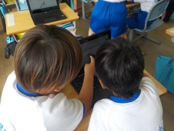 生き物調べ 1年生が、タブレットを使って生き物を調べていました。カマキリなど身近な昆虫などを主に調べていました。友達と相談し合いながら取り組んでいました…