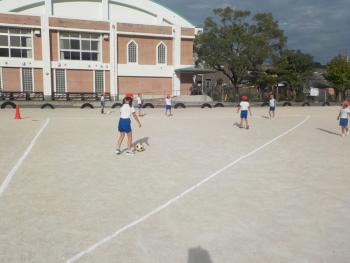 フットベースボール 3年生が、フットベースボールをしていました。三角にベースを置き、サッカーボールを蹴る練習をしていました。うまく蹴れるように友達とパス交換を熱…
