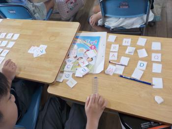 アルファベットゲーム 3年生が、外国語活動に取り組んでいました。今日は、アルファベットのことを学ぶためにアルファベットゲームに挑戦していました。答えが当たると喜ぶ…